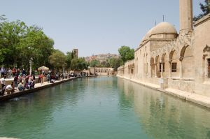 der legende nach soll abraham, der im islam als prophet verehrt wird, im alten urfa heidnische götzenbilder zertrümmert haben. dies nahm ihm der könig nimrod übel und wollte ihn auf den scheiterhaufen werfen. aber gott verwandelte das feuer in wasser und die glühenden kohlen in fische. abraham selbst wurde vom burgfelsen in die luft geschleudert und landete sanft in einem rosenbeet. drum schwimmen nun in den beiden fischteichen tausende angeblich heiliger karpfen, die auf keinen fall verspeist, jedoch gefüttert werden dürfen. sie sehen auch wirklich gut genaehrt aus...