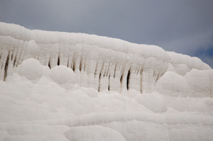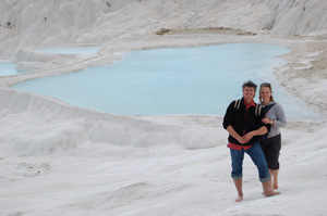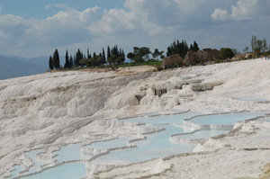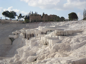 von selçuk aus geht die reise weiter richtung osten und landesinneres. wir wollen die berühmten weissen travertin-terrassen von pamukkale besichtigen. das dorf pamukkale ist klein und haesslich, ausser den terrassen und der antiken stadt hierapolis gibts nichts zu sehen. wir spazieren von unten den steinbruchartigen hügel hinauf und gelangen nach und nach zu den millionenfach fotografierten weissen wasserbecken. eigentlich siehts hier mehr nach gletscher aus!