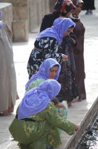 die menschen sind dunkler, es wird teilweise arabisch gesprochen. viele maenner tragen nebst einer art pluderhosen aus anzugstoff das 'palaestinensertuch' oder dasselbe lila kopftuch wie die frauen, welche teilweise in wallende, paillettenbestickte gewaender gehüllt sind. manche aeltere frauen haben kleine taetowierungen auf dem kinn.