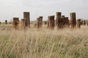 weiter gehts um den see zu einem riesigen friedhof mit seldschukengraebern. hunderte von grabsteinen sind zu sehen. die grabsteine aus grauem oder rotem tuffstein sind von flechten überwuchert und sehen aus wie abgebrochene zaehne.